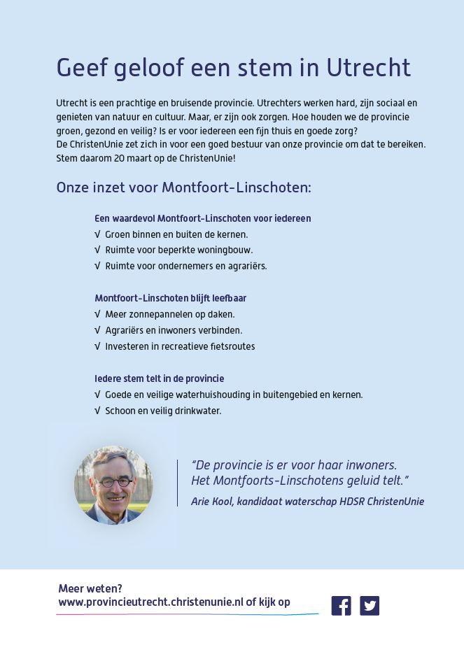 De ChristenUnie wil graag een eerlijk bestuur in de provincie. Een bestuur dat goed werk doet voor mensen en dieren. Stem daarom ChristenUnie op 20 maart!